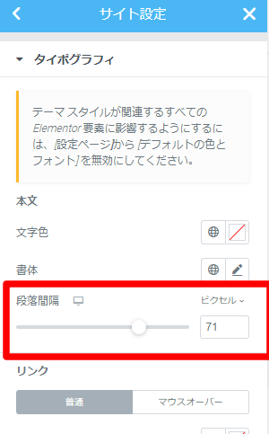 Elementorの段落幅を自由に調節する方法 Elementor 2023.03.22 ElementorのテキストエディターでEnterを押すと段落の間にスペースが出来ます。 段落のスペースの幅を調節する機能が「サイト設定」の中にあります。 「サイト設定」→「タイポグラフィ」→「段落間隔」で段落の間隔を調整できます。 https://i.gyazo.com/c681625d43b33a390dac35d8202183c7.mp4 補足として、sheft+Enterで改行するとスペースは出来ませんが、 段落のスペースを調整したいときは、こちらを設定すると幅の調節が自由に出来ます!